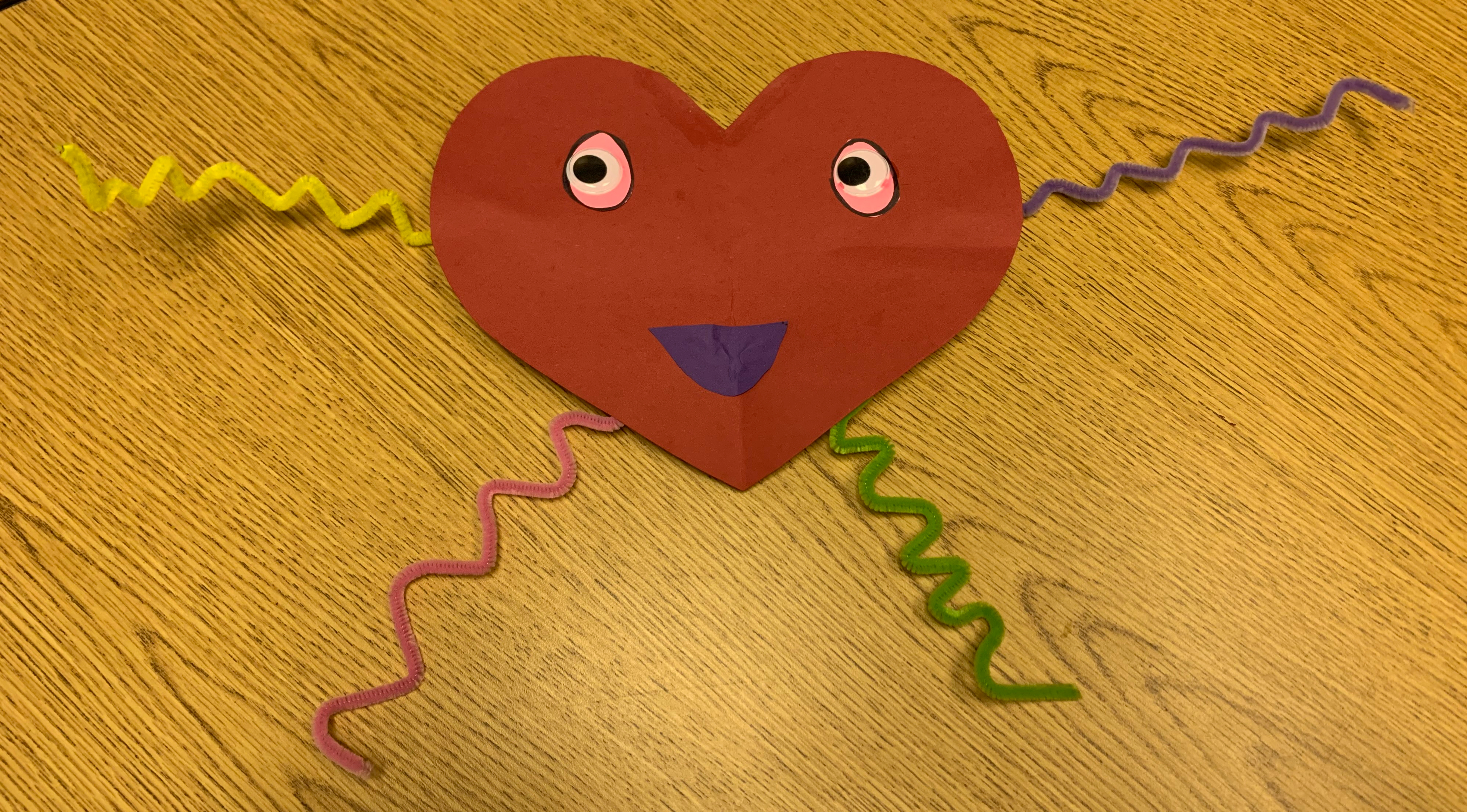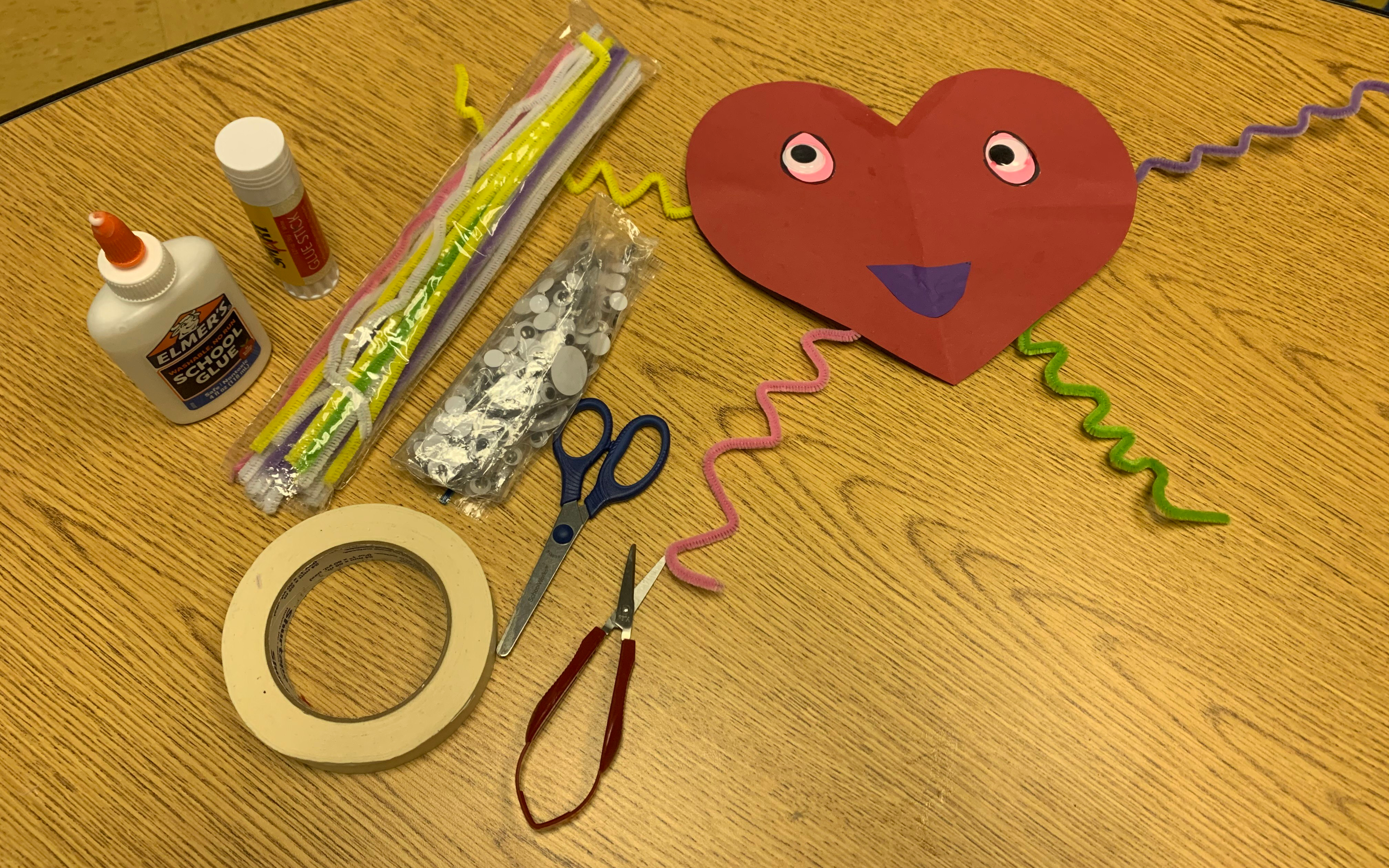 My craft consists of construction paper in red, purple and pink, scissors, glue, pipe cleaners, googly eyes and tape. I included loop scissors because I have some children who are unable to use regular scissors. I prepped the hearts, the mouth and the eyes, by drawing bold guidelines for the child to cut on. They were able to choose their googly eyes and pipe cleaners for the arms and legs.